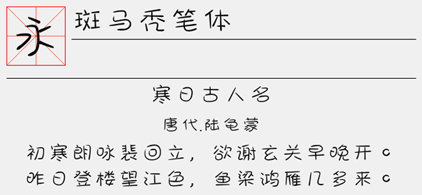 斑马秃笔体字体是由斑马字库推出的一款手写行书艺术字体,该字体收放有度、运笔简洁、圆浑流畅。字型的角度、大小、距离都设计的非常完美,展现了其独特的个性书法,可以很好的应用于文本装潢、信息展示、网页设计、篆刻制模、数据制作、装潢设计、计算艺术设计、视觉设计、字帖等一切合法应用场景,有喜欢的朋友可免费下载收藏。