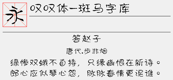 斑马叹叹体字体是一款赏心悦目、百看不厌的艺术字体,书写非常的飘逸有个性,字形也是采用粗粗的样子打造,整体的视觉效果非常的出众。整个字体看上去似乎可以非常自由地编写,而其中还带有一点点涂鸦效果,可很不错地识别并具有良好的实用性和艺术性。可以很好的应用于文本装潢、信息展示、网页设计、篆刻制模、数据制作、装潢设计、计算艺术设计、视觉设计、字帖等一切合法应用场景,有喜欢的朋友可免费下载收藏。