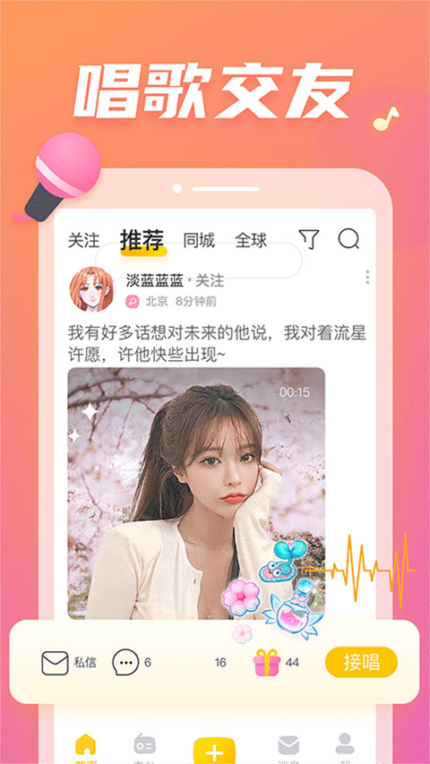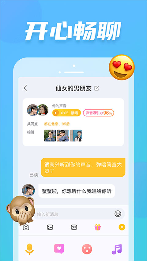 1、私信聊天,和好友愉快畅聊。 2、唱一句你喜欢的歌,用歌声展示你自己。 3、接唱,选择你喜欢的人发布的歌声接唱。 4、发布动态,倾诉内心世界,寻找有共鸣的朋友。功能介绍