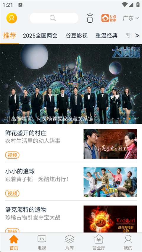 1、掌上直播精彩满格 电视接入广电网络,即享各路电视台直播节目,各路直播频道尽收眼底。 2、海量点播一键畅享 精选点播媒资免费观看,精编谷豆影视专题,多种题材精彩无限。 地市荟萃网罗本地优质电视节目内容,打造粤味文化专区 3、多屏互动乐享加倍 手机秒变遥控器,声控搜索更加精确。 一键投屏,电视大屏任性秒播,视听全面升级。 4、同步电视直播随心看 完整节目单,随时回看。 5、一触即播无需等待 没有任何贴片广告,注册接入广电网络,即点即播零等待。软件亮点