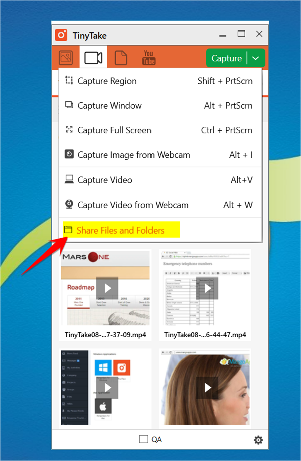 2、启动TinyTake,然后点击捕获下的“共享文件和文件夹”选项。您将看到一个对话框,用于拖放要与任何人共享的文件。完成后,将生成一个链接,您可以与任何人共享该链接。