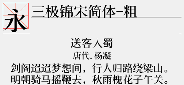 三极锦宋简体粗字体是一款非常不错的印刷字体,该字形整体略偏瘦长,字体的竖撇点折等都做了相对应的45度圆角处理,笔画与字形二者相结合整体结构灵活不呆板,特别是点的设计,乍一看犹如微风缓缓吹拂着的柳叶,风度翩翩,端庄高雅而标致,可以很好的应用于文本装潢、信息展示、网页设计、篆刻制模、数据制作、装潢设计、计算艺术设计、视觉设计、字帖等一切合法应用场景,有喜欢的朋友可免费下载收藏。