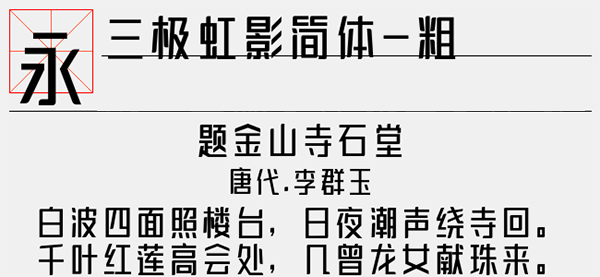 三极虹影简体粗字体是一款较粗的字体,其字形清新,布白均匀,字形结构饱满匀称、柔美,中宫偏大,笔形挺拔流畅,笔锋锐利简洁。撇、捺起笔收笔统一,个性鲜明,富有朝气,并且中英文、阿拉伯数字全面支持,可以很好的应用于文本装潢、信息展示、网页设计、篆刻制模、数据制作、装潢设计、计算艺术设计、视觉设计、字帖等一切合法应用场景,有喜欢的朋友可免费下载收藏。