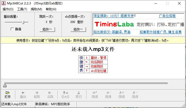 1、边听边设置a、b剪切点,快捷键如下:* (↓)播放、暂 停。* (→)向前跳跃。* (←)向后跳跃。* (↑)剪切点(a/b)定位键。2、音质保障:直接剪切mp3文件,没有音质损失。