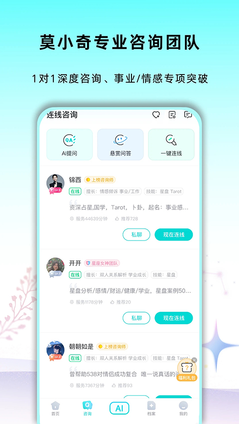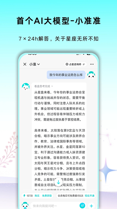 1、星座女神团队匠心打造 2、占星师们对它爱不释手 3、星座女神莫小棋全力加持 4、星座爱好者绝对不可不看 5、集实用与专业于一身的星座运势预测APP。功能介绍