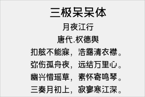三极呆呆体字体是由三极字库推出的一款几何型构成的作品,它的灵感来源于管状物体,直接简单,坚韧不屈,给人一种直接干练的感觉。该字体整体风格率真,直接,又稳重简洁,笔画平直、粗细匀称,起笔为圆头温柔可爱,收笔平直天真率气,具有强烈的个性,可以很好的应用于文本装潢、信息展示、网页设计、篆刻制模、数据制作、装潢设计、计算艺术设计、视觉设计、字帖等一切合法应用场景,有喜欢的朋友可免费下载收藏。