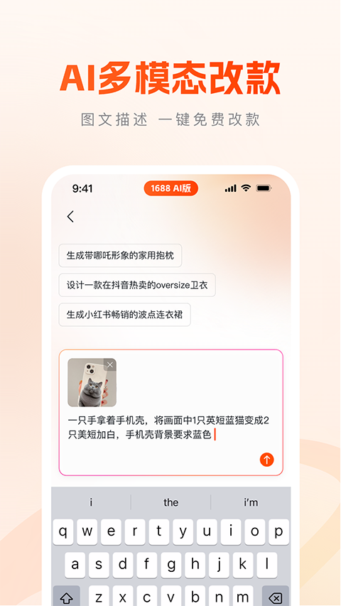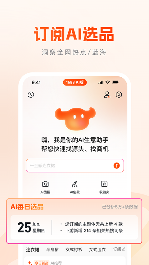 1、【每日商机推荐】 根据你的兴趣、偏好和关注话题,AI每日为你提供个性化选品资讯,让你及时了解新品和趋势商机,抢占市场先机。 2、【智能图片搜索】 上传图片,快速查找所需商品,节省你的搜索时间,提升效率。 3、【个性化Agent】 配置你的专属Agent,实现精准推荐,让选品不再盲目,更加高效。 4、【AI商品改款/新款生成】 释放你的创意,让你的商品更具个性,更受市场欢迎。更新日志