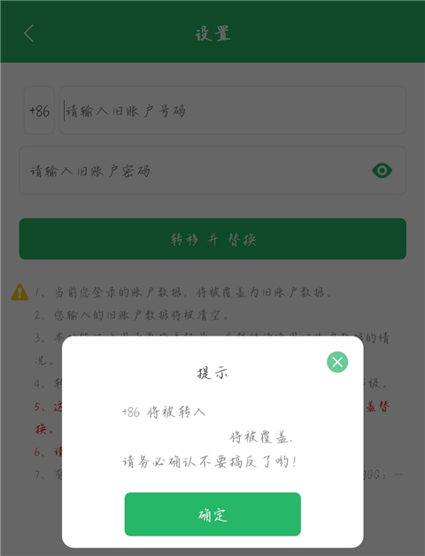 4、输入旧账户的手机以及密码,点击【转移并替换】。