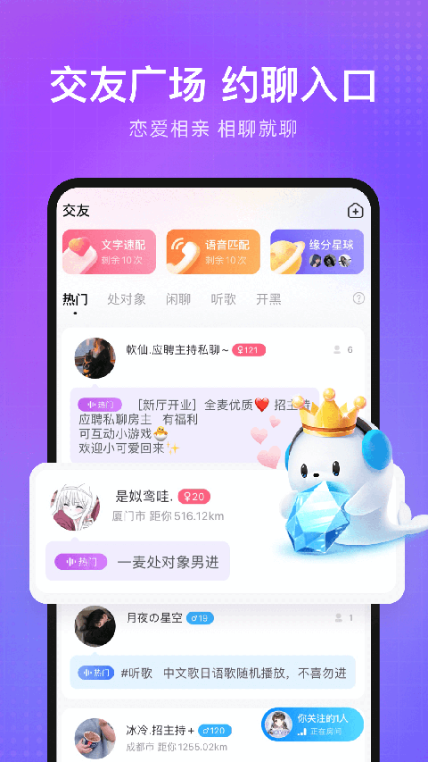 1、星球速配 交友星球,邂逅你喜欢的TA 2、交友广场 cpdd、斗图,分享你的生活 3、语聊房间 娱乐、交友、开黑、看电影,超多功能等你来玩 4、温情陪伴 声优级别小哥哥小姐姐,陪伴你渡过属于你的美好瞬间更新日志