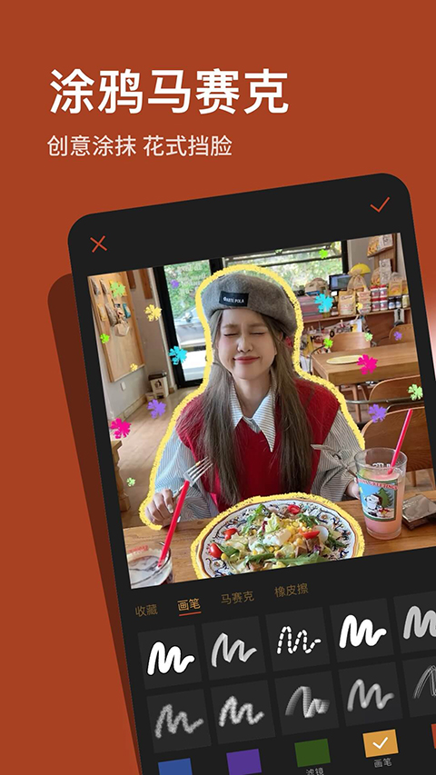 1、复古贴纸: 1000+精选复古童趣贴纸 2、实用文字: 自定义文字与多种样式 3、童趣画笔: 轻松打造热门涂鸦风 4、胶片质感: 模拟复古质感的同时星光闪闪 5、基础调节: 满足细致调节的小心思功能介绍