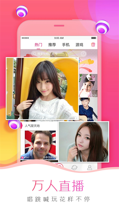 【魔法美颜】:智能美颜,一键操作,人人都可以玩的直播; 【万人直播】:高颜值萌妹直播,24小时不间断,填补你的寂寞时光; 【同城交友】:搜索你身边的主播,让你们的距离更近; 【游戏互动】:边游戏边聊天,轻松搭讪,总有一款妹子懂你 【炫酷礼物】:培花守护、炫酷礼物、实物红包,直播互动嗨翻全场。 【天天有奖】:每日登录签到获得抽奖机会,赢取话费或绝版小礼物;常见问题: