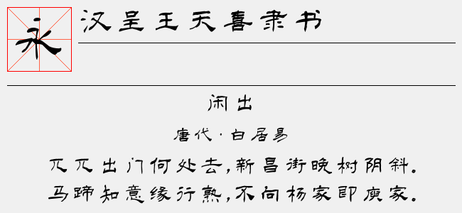 汉呈王天喜隶书字体是由汉呈字库中天喜系列的一款毛笔飞白隶书字体,其字体扁方工整,字形规范,气质庄重,刚柔并济,表现力十分丰富,具有很好的视觉感,且字库完整,可以很好的应用于文本装潢、信息展示、网页设计、篆刻制模、数据制作、装潢设计、计算艺术设计、视觉设计、字帖等一切合法应用场景,有喜欢的朋友可免费下载收藏。