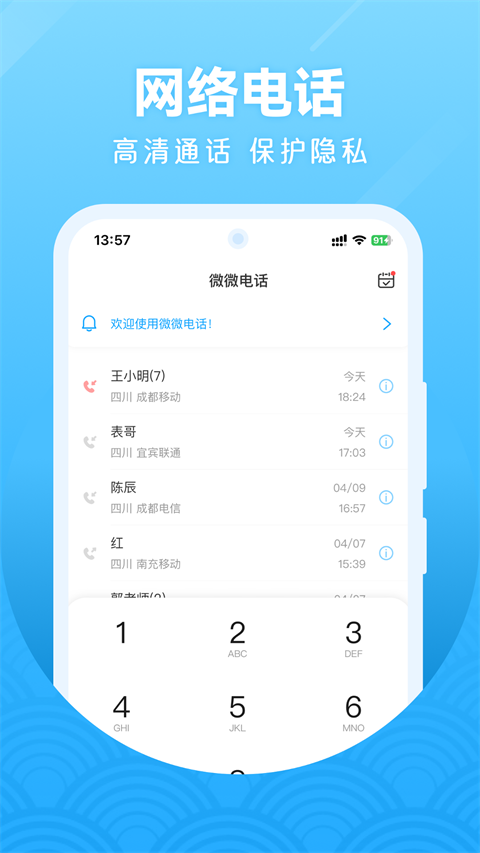 【每月话费严重超支?经常出差?国际长途太烧钱?】 能免费拨打全球座机、手机,手机停机也照样打!微微好友间,享免费高清语音、视频电话。 【打电话不显号被拒接?】 微微电话可显示真实手机号码,拒绝被骚扰拦截;还可一键切换微微靓号,避免中介、推销电话,将烦恼一扫而空。 【如何记录重要电话?】 打电话时轻松开启录音功能,记录你的每一通重要电话;电话内容录制在本地,可随时随地听取。 【发消息,担心暴露隐私?】 除了文字、语音、图片外,还能够发送无痕消息,阅后自动销毁,保护隐私不留痕。 【语音还能这样玩?】 点歌祝福、节日问候、向TA表白、搞笑段子、趣味恶搞,把电话玩出个性。 【想同时和多人通话?】 可随时召集最多达30人的电话会议(会议人员无需安装微微电话),一次通话完成多人沟通。 【电话秘书模拟来电?】 创建预约来电,微微秘书可在预定时间来电提醒你,不错过任何重要约会,还可摆脱无聊场合。软件特色