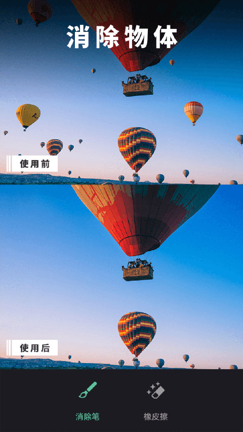 1、无痕去水印:不同水印的视频特效可以直接的在这里添加编辑,只要是自己想要的都可以添加 2、消除水印:各种视频图片中已有的水印可以让用户直接的编辑游玩 3、裁剪比例:修图去水印还可裁剪视频的大小尺寸,非常实用非常有趣的编辑玩法 4、裁剪时长:可以裁剪的大小时长,各种不同的细节可以直接的让用户在这里游玩 5、水平翻转:各种类型的大小样式可以直接的完成,添加不同类型的样式吧 6、视频旋转:可以旋转视频的画面,各种不同的视频的特效可以直接的完成更新日志