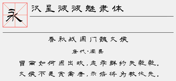 汉呈波波魅隶体字体是隶书类的中文书法体,并是由汉呈字库出品的,字体以隶体为基础进行修饰改良,如同其名字一般,自带鬼魅之感,非常独特,吸引眼球。并且它全体规划规矩大方、字体粗细均匀、形象漂亮,活泼有趣,俏皮可爱。可以很好的应用于文本装潢、信息展示、网页设计、篆刻制模、数据制作、装潢设计、计算艺术设计、视觉设计、字帖等一切合法应用场景,有喜欢的朋友可免费下载收藏。