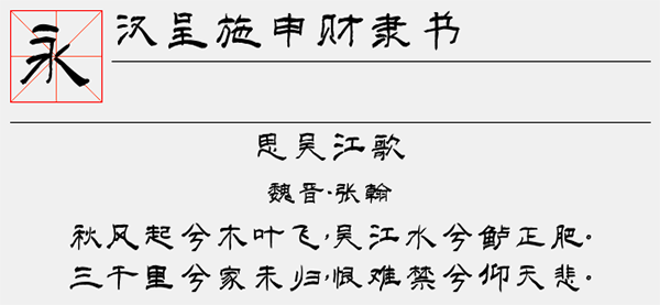 汉呈施申财隶书字体是一款赏心悦目、百看不厌的中文隶书字体素材,为隶书曹全碑和礼器碑的结合体,外形气韵秀丽,正中寓欹,平和简静,内刚外柔,突出表现了中国汉字线条与结构美感。字体借鉴隶书的笔形,在结构上做了调整,字体的布白更均匀,识读性更强。可以很好的应用于文本装潢、信息展示、网页设计、篆刻制模、数据制作、装潢设计、计算艺术设计、视觉设计、字帖等一切合法应用场景,有喜欢的朋友可免费下载收藏。