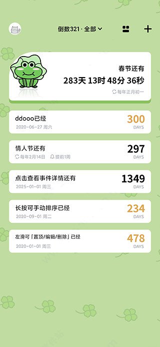 1、约会/恋爱/结婚 和ta的重要日子不能忘记,提前准备礼物和惊喜吧。 2、生日/聚会/旅游 好朋友在一起的生日、聚会、出游,都是值得纪念的美好。 3、中考/高考/考研 考试没多少天了?别慌,有我们提醒,你每天都在认真学习哦。 4、五一/国庆/春节 各种传统节假日提醒,提前做好假期游玩计划吧。 5、事件/任务/项目 为重要事项设置倒计时提醒,工作学习安排从容不惊。更新日志