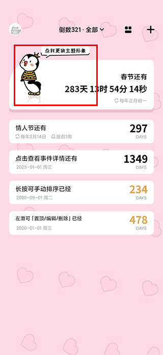 1、可爱的萌宠守护你每个关心的日子。 2、支持设置农历事件,记录传统节日更方便。 3、自定义分类,再多的重要事件也能轻松管理。 4、自定义背景,打造专属的纪念日样式。 5、设置提前提醒,在重要日子来临前及时提醒你。 6、事件置顶,将最重要的日子置顶展示。 7、一键分享,分享你独具个性的事件图片,一键管理多个倒数事件。 8、桌面小组件,无需打开app即可快速查看事件信息。使用场景