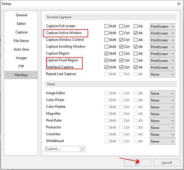 2、设置截取固定区域的快捷键,我个人习惯“ALT+Q”,大家可以根据自己的喜好设定,当然不怕麻烦使用默认的快捷键也可以,按确定键完成设置。