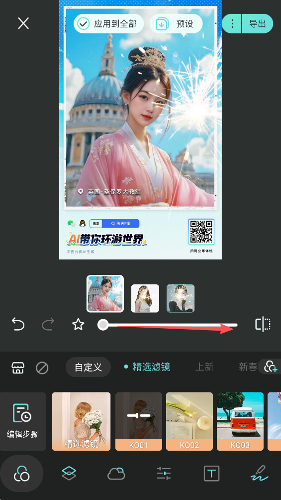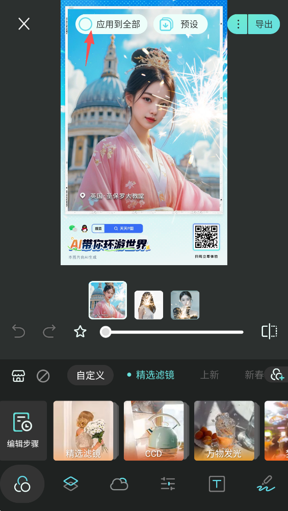 6、切记,点击屏幕上方的“应用到全部”,否则依旧只是单个图片进行编辑。