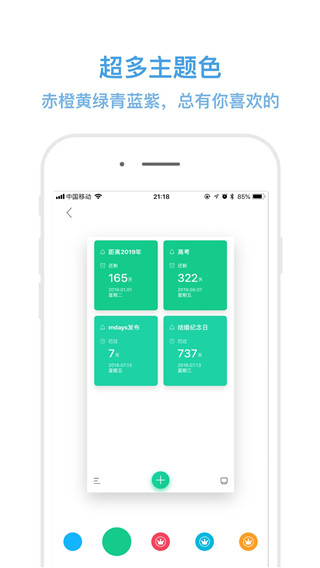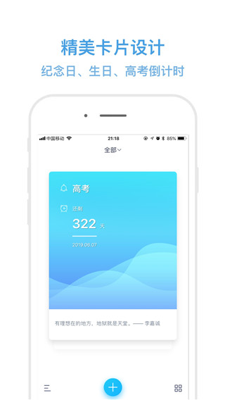 1、精美的卡片式界面 2、是你记录日子的最佳选择 3、记录你生活中重要的日子 4、可以是纪念日、生日、高考倒计时、重要日程使用方法