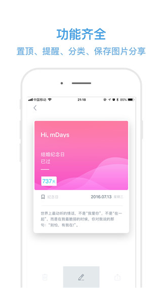 1、记录日子 纪念日、生日、高考倒计时、重要日程等 2、日子提醒 纪念日、倒计时、生日等到期提醒 3、日期计算器 计算两个日期间隔,以及推算N天前后的日期 4、自定义背景 为你重要的日子,选上一张漂亮的背景或者照片 5、分类 分开记录你的纪念日、生日、倒数日等 6、置顶 把重要的日子,置顶在最醒目的地方 7、主题色 多种主题任君选择,选你喜欢的颜色 8、日历 查看每月份的重要日子 9、云备份 云端保存你的数据,重要日子不丢失 10、搜索 日子太多很难找,只需输入关键词即可找到 11、密码解锁 数字密码或指纹解锁软件亮点