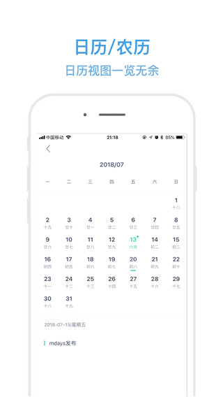 1、日历,可以在本应用查看日期,查看每月的所有重要日子,提前知晓 2、设置提醒,可以设置纪念日、生日、考试倒数日等等,到期提醒 3、可以设置提醒时间,可以设置提前提醒时间,比如设置纪念日前三天提醒 4、日期计算,计算日期之间的间隔,和推算某一天的前后日期 5、自定义背景,可以为特殊的日子自己设计一张特殊的背景 6、云备份,所有的数据全部会上传到云端,让所有数据都不会丢失软件特色