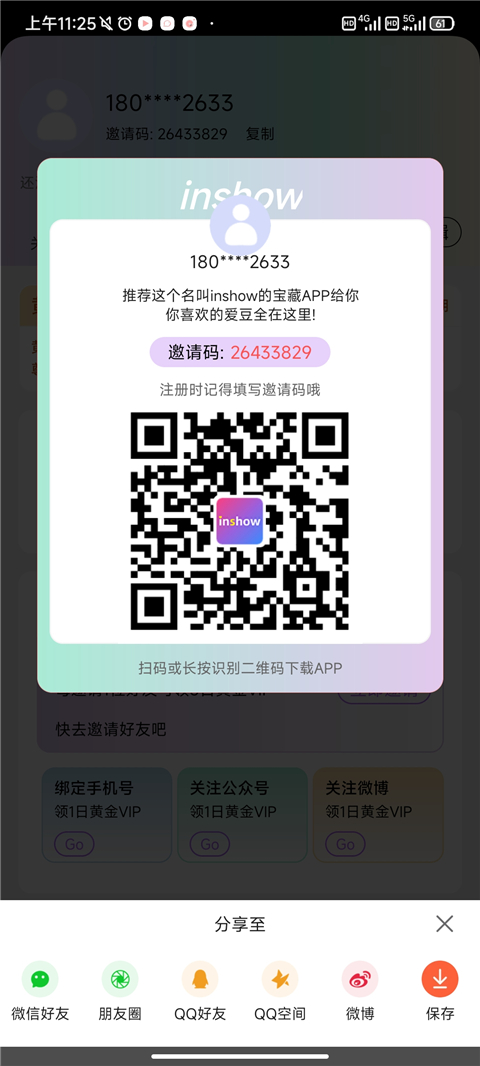2、接着会出现二维码和邀请码,发送给朋友就可以了,邀请好友还可以获得5日黄金VIP