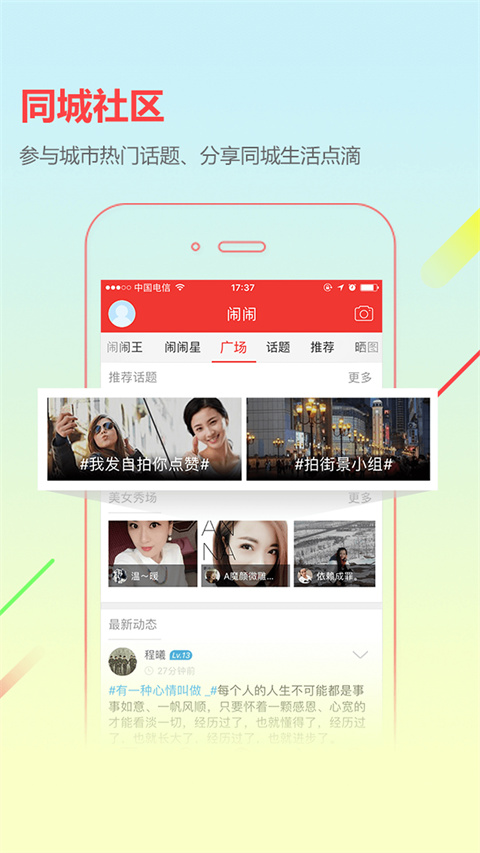 1、热门事 本地热点资讯、同城爆料、百姓事随时随地掌控; 2、精彩人 本地美女、帅男、萌宝秀场分享美丽、秀出自我、结识朋友; 3、交流场 参与城市热门话题、加入兴趣圈子分享同城生活点滴; 4、聪明购 本地商家优惠促销信息,同城购物指南; 5、百事通 找工作、二手房买卖、新楼盘、二手交易等城市生活服务; 6、积分商城 做任务领城市币、积分玩转盘多种实物好礼随意兑换。软件特色