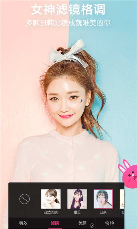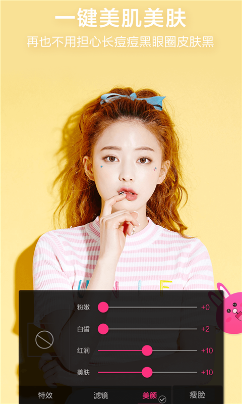 1、超模全身模式 从大眼到瘦脸,从嘴角部到身材曲线,每个细节都可以随意调整,给你超模般的体验。 2、网红滤镜 精选百款致美滤镜,从此不再巨丑无比!轻颜妆容,超A质感搭配神仙滤镜,韩系、日系、ins、欧美,找到适合你的Style。 3、实时视频美颜 视频磨皮算什么美颜,要的是硬币眼、细高鼻、巴掌脸、大白牙!多种实时动态美颜功能,细致调整五官,边拍边美,给你照镜子般的惊艳体验。 4、趣味变声聊天 新增趣味变声聊天功能,支持语音转语音,文本转语音变声,大叔、萝莉、温柔等变声主播任您挑选,让聊天更加好玩不会尬聊。更新日志