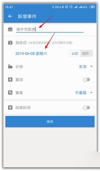 3、即可进入新增事项页面,输入事项名称,选择事项目标日。