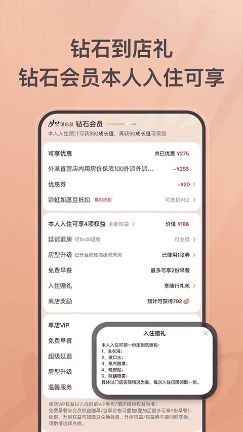 热门话题(社区):旅行美食美景打卡推荐 酒店周边:多种酒店周边权益可选,让您的旅程更丰富多彩 动态行程:实时掌握入住状态、航班动态、列车动态; 自助选房:在线选房,直接到酒店入住即可; 自助续住:在线自助续住,无需前台再办理入住手续; 客房遥控:客房电器App遥控,酒店设施操作更轻松。更新日志