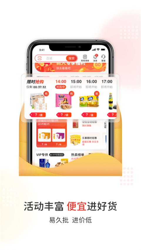 1、首页:轮播推荐、聚合活动、热门产品、快捷功能入口,大卖商品入眼既是。 2、进货:修食百货、酒饮副事,实用专区分组方便快捷。 3、连锁加盟:易尔惠批发超市合作加盟火热进行中。 4、购物车:您要进的货,都在这呦。 5、我的:会员中心、帮助中心、帮我找货、订单管理、快捷进货/常够清单/收货地址/修改密码,各种功能满足您的需要。易久批平台进货app如何注册