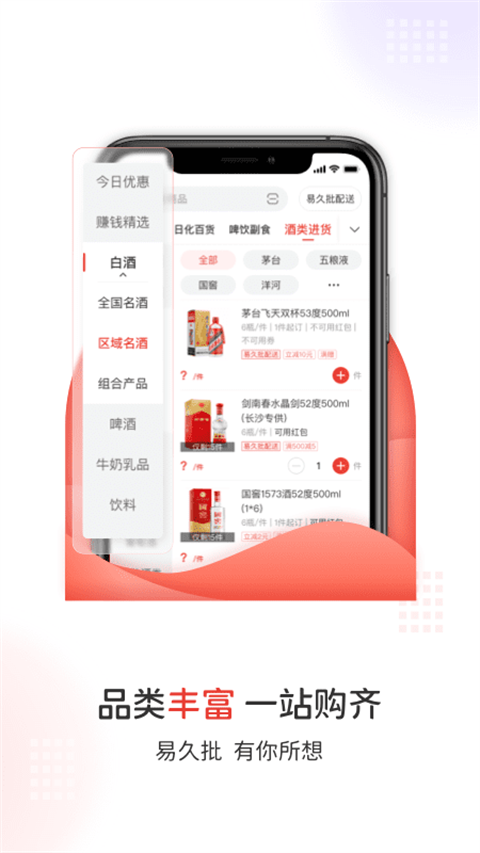 1、【多】 品项齐全——白酒饮料红酒啤酒茶叶等全品项一站式采购。 2、【快】 快速送达——当日/次日送达,不用等待。 3、【好】 一件起送——1件起免费送货上门,不占库存占资金。 货到付款——收货、验货后,放心再付款。 4、【省】 价格便宜——进货价更低,让您赚得更多。 查价比价——比比你的采购价,看看当天批发行情。 5、【真】 产品保真——假一赔十,贴标销售,产品溯源。常见问题