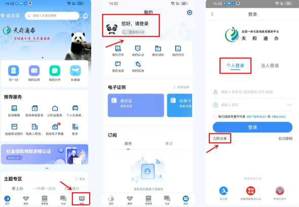一、个人如何注册“天府通办”APP? 第一步:打开“天府通办”APP,依次点击首页下方菜单栏【我的】——【您好,请登录】——【立即注册】按钮。