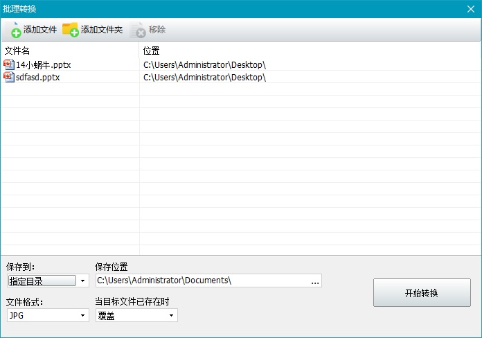 3. 在这个批量转换窗口里,可以添加多个PPT文件,设置好保存位置等相关选项后,点击右下角“开始转换”按钮,即可以一键将所有的PPT文件转换为长图图片了。