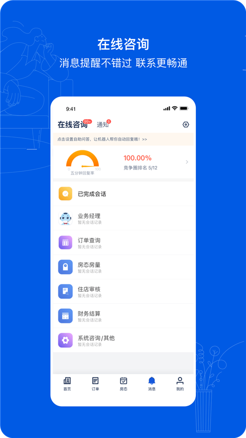 一、房态管理 1、支持您实时管理当前房态和保留房。 2、每日房型房态展示,掌上房态日历。 3、开关房、限量售卖等设置; 4、保留房数量调整; 二、订单管理 1、支持您实时接受、处理和查询订单。 2、手机上可进行接受、拒绝、修改预订号等各类操作; 3、查询订单功能,查到店、查订单号更便捷。 4、具有新订单提醒功能; 5、显示当前未处理订单数量。软件优势