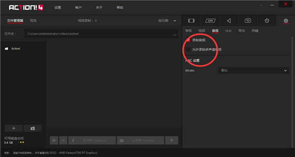 3、点击音频选择是否录制声音以及是否进行多声道录制