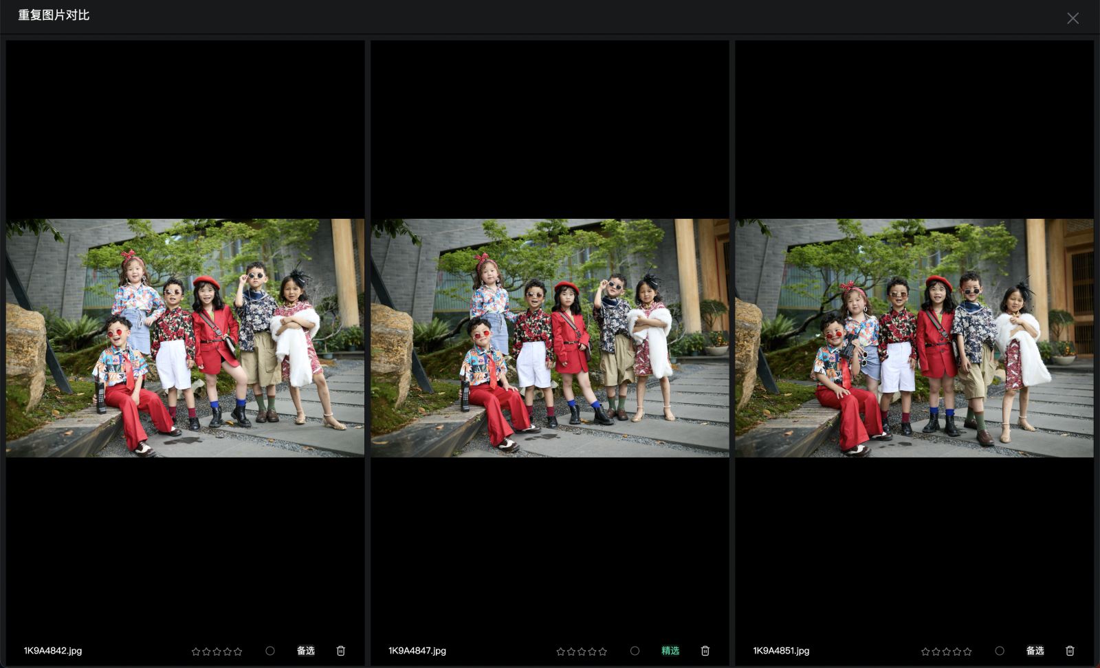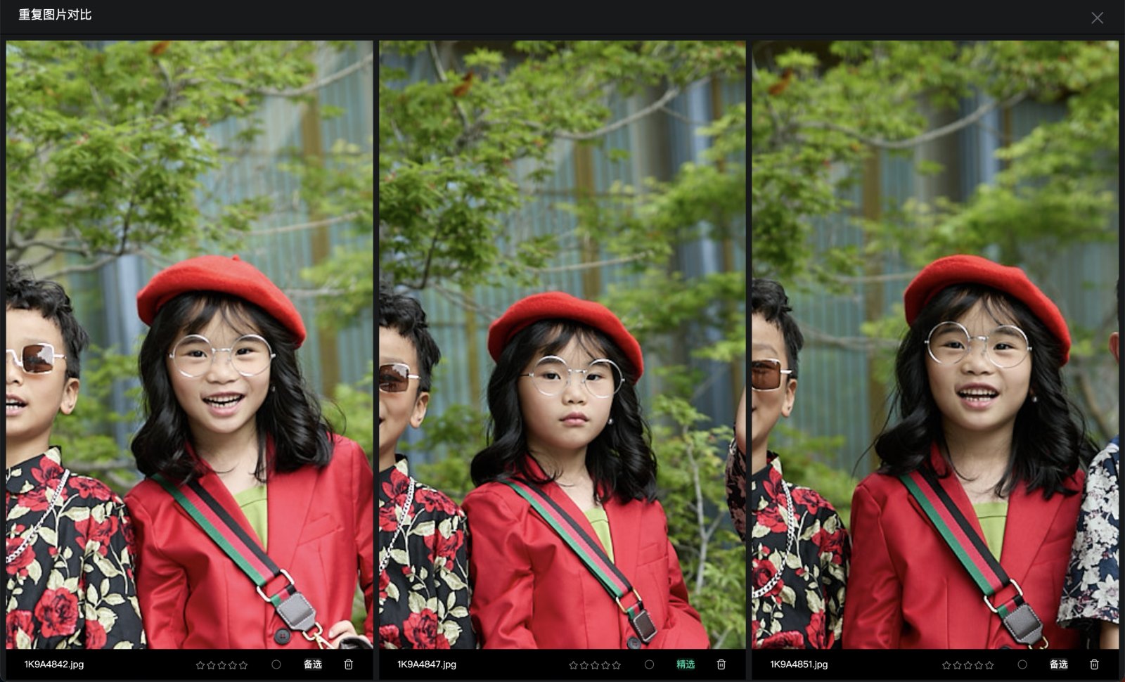 标准:场景和人物完全相同、人物动作略有不同的照片,都会被识别为重复图片;