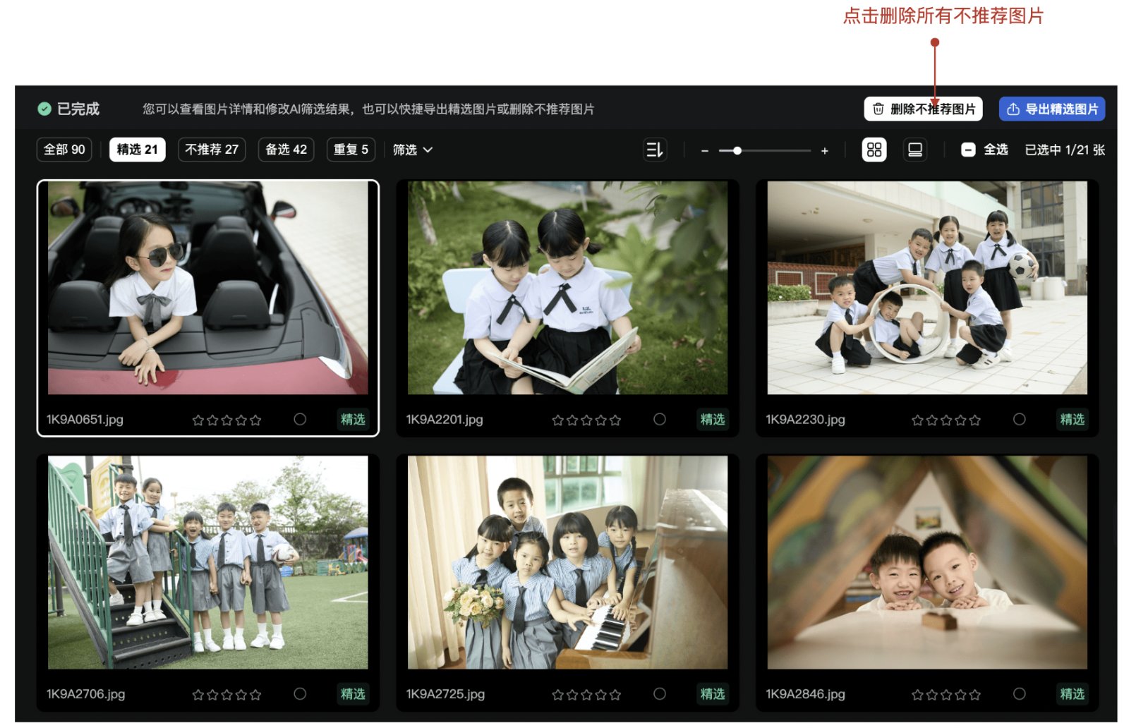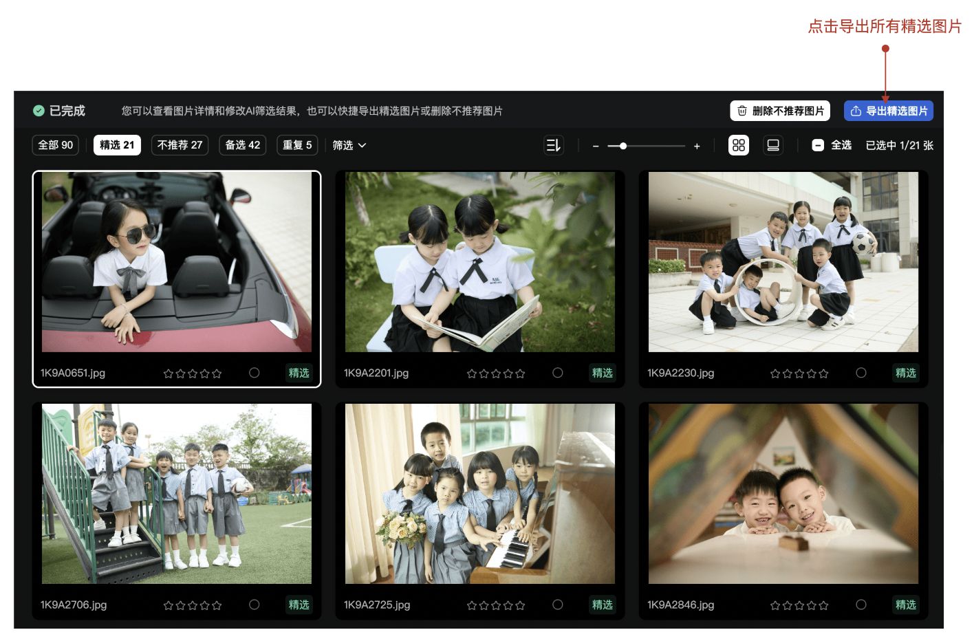 点击图片区域上方的“导出精选图片”按钮,即可导出所有标记为精选的图片