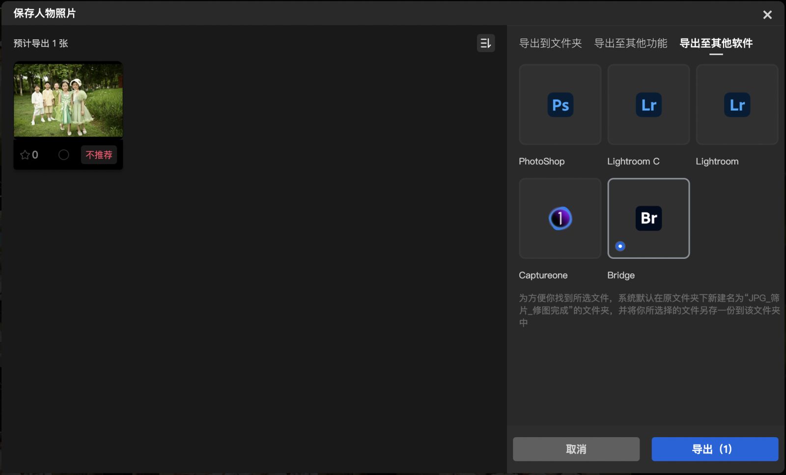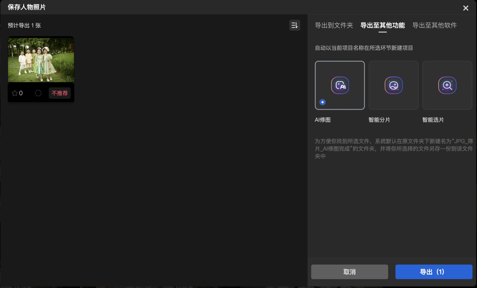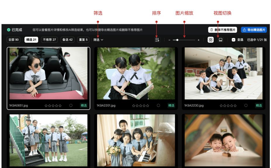 导出到其他功能:可以直接把挑选后到照片导入到AI修图、在线选片、AI多人分片中,减少操作步骤