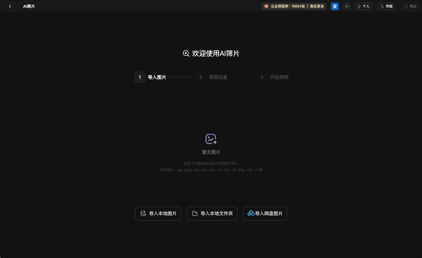 导入需要筛选的图片,支持导入本地电脑、百度网盘中的图片。最多支持导入1万张。