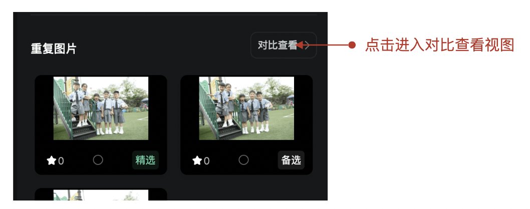 为了更高效地对比重复图片,可以通过2种方式进入重复图片对比视图中: