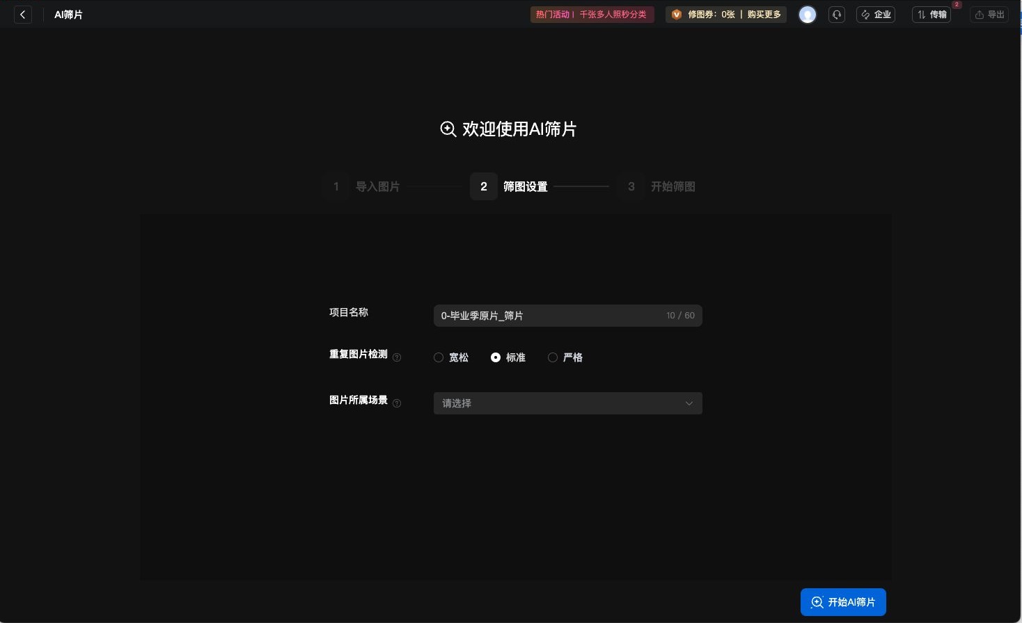 1、新建AI筛片项目 在左侧功能导航栏,切换到“AI筛片”功能上。有2种方式可以新建一个AI筛片项目: 点击“+”号,新建AI筛片项目 先选择本地电脑的图片,直接拖入到软件里,也会新建AI筛片项目