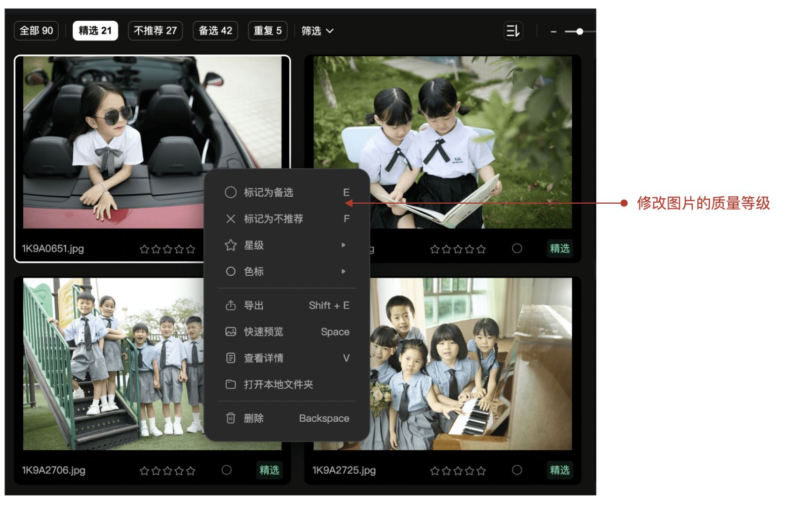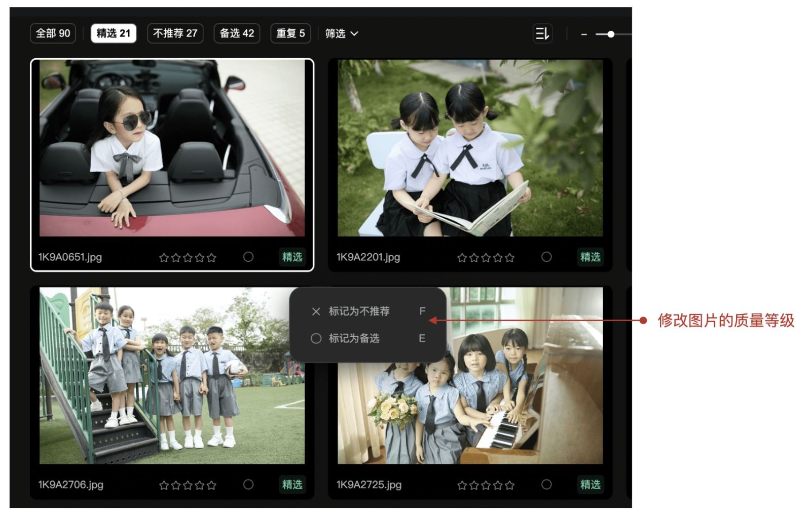 鼠标悬浮在图片右下角的精选/不推荐/备选上,会自动出现不同质量等级,点击可切换