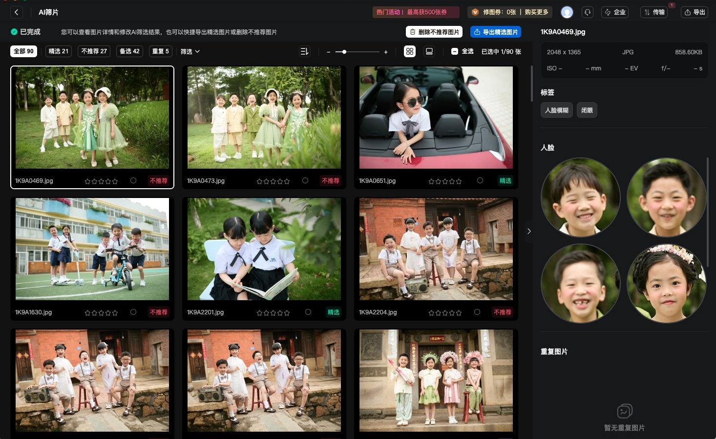 AI筛片结束后,能看到图片被分为了“精选”、“不推荐”、“备选”三类,点击可以查看不同质量等级的图片。