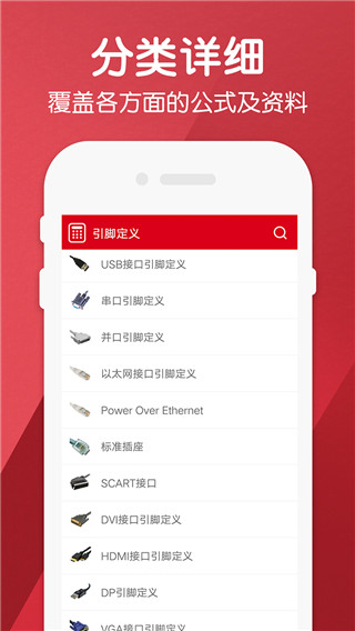 【全面】拥有最全面的电气计算功能,主要分为电动机、转换、引脚定义、公式、资料等类型,分类非常详细,电气工作者可以根据自己的工作选择适合的计算功能 【强大】可以用来计算电压降、电流、电压、有功功率、电机转速、电机效率等等,覆盖四色环(码)电阻计算、五色环(码)电阻计算、电感色环(码)计算,辅助学习电学基础知识、电工工具、变配电及低压电路安装、小型同步发电机、电工作业所有需要进行计算的功能 【效率】可以帮助你轻松快速计算出各项电工工作问题,电阻降低电压、阻力为主导、功率因数校正、电压电流等相关知识大大提高工作效率 【分类】分类详细,覆盖电动机、转换、引脚定义、公式、资料等各个方面。使用方法