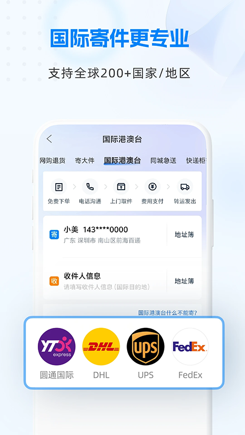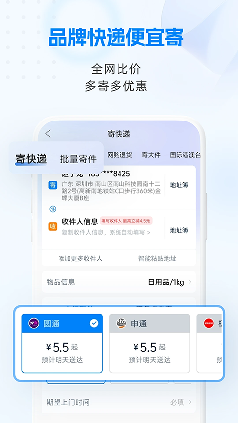 1、【比价寄件】 首页发放优惠券,低至6元起/单!汇聚顺丰/圆通/中通/申通/韵达/极兔/京东/德邦等品牌快递,一键比价查时效自由选,上门取件,丢损必赔; 2、【批量寄件】 提供批量寄件优惠价,2单起享,低至4元/单,寄越多省越多!批量操作方便,多收件地址,一键下单; 3、【寄大件】 5公斤以上快递使用,省钱又省力; 4、【网购退货】 支持上传商家地址截图退货,线上购物无忧退; 5、【国际港澳台寄件】 支持市面知名快递公司,如FEDEX、DHL、圆通国际、顺丰国际、邮政国际、极兔国际等。支持全球200+个国家及地区邮寄,清关高效,专业顾问全程1v1服务。 6、【同城急送】 同城送包裹,平均20分钟上门,1小时送达; 7、【快递柜寄件】 寄件无接触,安全更省心; 8、【商家寄件】 中小微商家专属服务,全国寄件最低3.5元起;更新日志