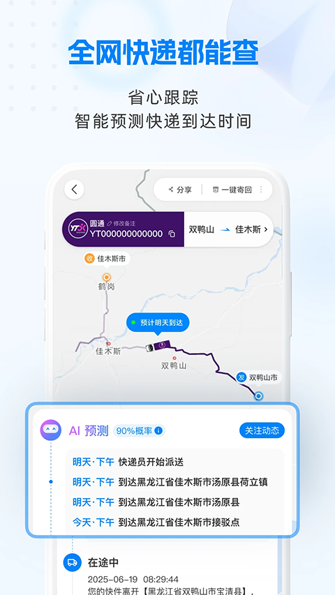 1、自动保存查单记录,云存储,多设备同步,不管小程序、公众号、H5、PC通通都可以同步 2、一键添加您的专属快递员、免手写电子面单、在线支付运费等,更多寄件功能等你来体验 3、智能快递状态实时监控,主动推送取件、派件、签收、疑难等多类型的状态通知、防打扰等贴心功能 4、快递100app内支持全球 1000+ 物流快递单号智能查询、智能快递单号识别,国际快递、国际邮政大包、小包统统能查 5、微商用户一致好评!支持淘宝京东微店等十几家电商单号一键订单导入,更有批量扫描、异常件监控等功能软件功能