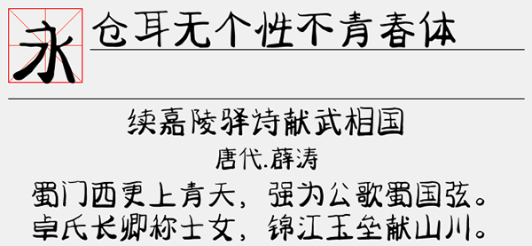 仓耳无个性不青春体是一款赏心悦目的手写字体,采用软笔书写,笔画从上到下逐渐加粗,字形可爱中不失稳重,是一款创新的手写字体,为了丰富字体市场的种类资源,增加字体的趣味性,设计师选用粗细变化更加丰富的软笔创作这款字体,将笔画粗细进行调整,每一个字从上到下笔画由粗变细,给字体带来一种全新的视觉冲击。可以很好的应用于文本装潢、信息展示、网页设计、篆刻制模、数据制作、装潢设计、计算艺术设计、视觉设计、字帖等一切合法应用场景,有喜欢的朋友可免费下载收藏。